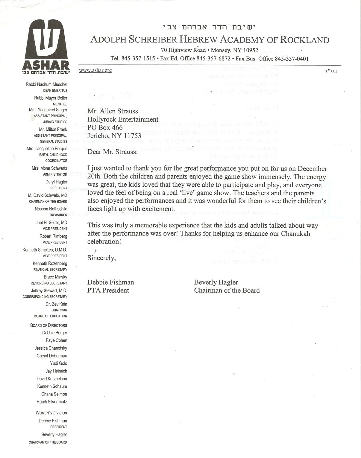 Westchester Hebrew High School "Eight years ago a teacher at another school told me how good your game show was. She was correct! It was beyond stupendous! See you next year." Dr. Nancy Block, Teacher & Programing Director |