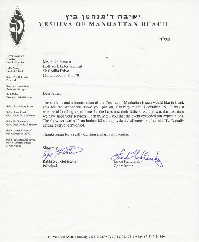 The Frisch School Music teacher, Mr. Mark Infield first saw our show as a director at Camp Nesher sleep-away camp. For the past 14 years, he and principal Rabbi Ciner have used "Brain Challenge" at The Frisch School. We have also done two Bat Mitzvahs for Mr. Infield's Family. |